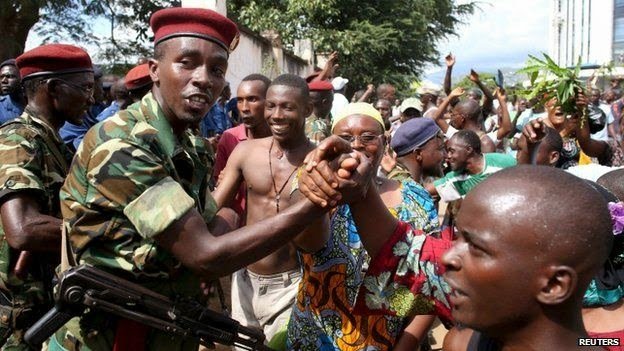 Protesters in Bujumbura celebrate the apparent dismissal of the president, 13 May