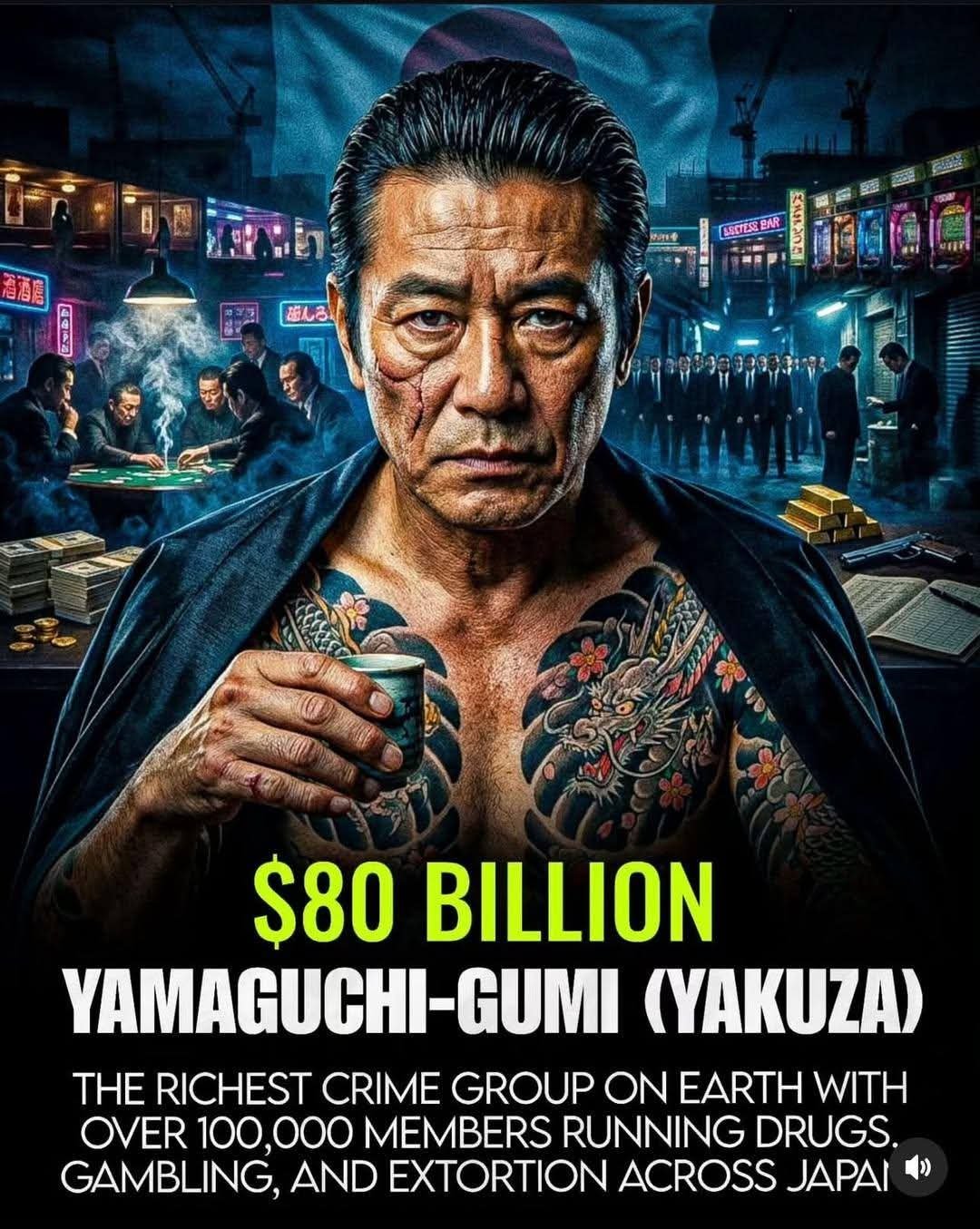Details: It is Japan’s largest Yakuza syndicate. The $80 billion figure originated from a widely cited 2014 estimate, though other sources estimate its annual revenue closer to $6.6 billion. It is a highly centralized organization involved in drug trafficking, gambling, extortion, and real estate kickback schemes.