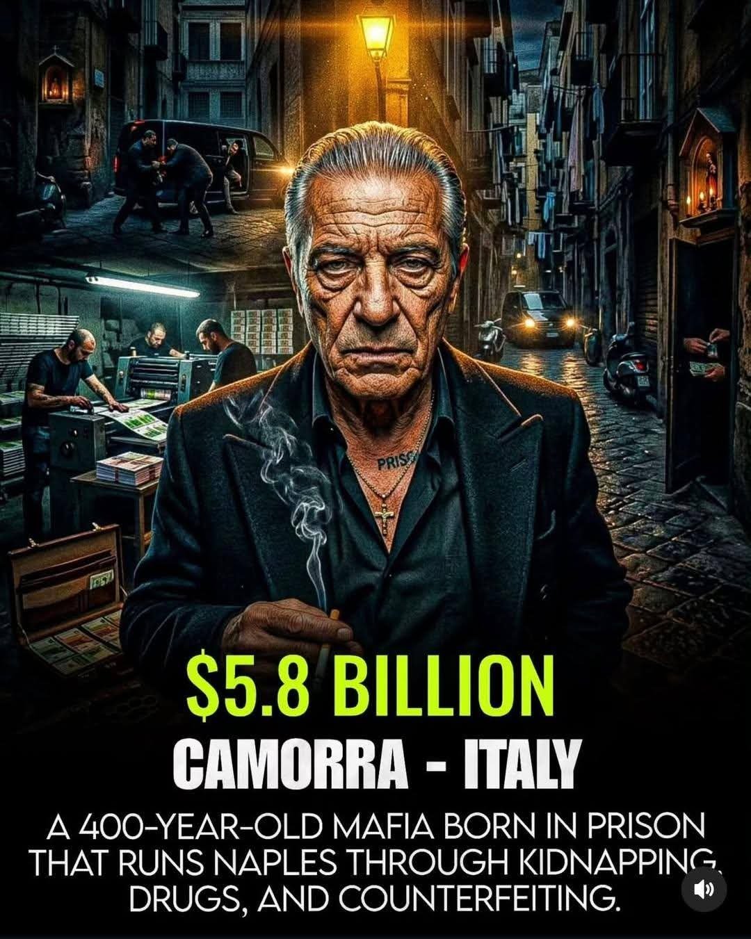 Details: A centuries-old mafia based in Naples, it originally formed as a prison gang in the 19th century. Its diversified income includes drug trafficking, counterfeiting, kidnapping, and gambling.