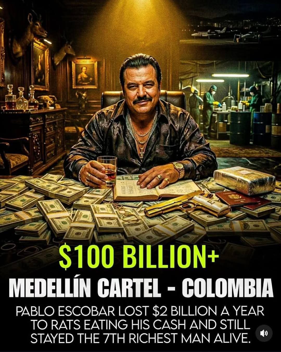Details: Led by Pablo Escobar at its height in the 1980s, the cartel reportedly earned up to $420 million per week. Escobar was famously listed by Forbes as the 7th richest man alive in 1989. A well-known anecdote claims the cartel lost roughly $2.1 billion annually (about 10% of its cash) to rats eating it or water damage in storage.