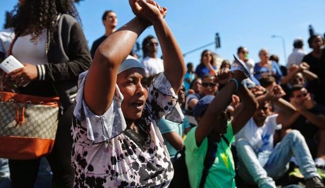 Hundreds of members of the Israeli Ethiopian community protested against discrimination and police brutality on Sunday in Tel Aviv, calling out “Not black, not white, we’re all human beings.”